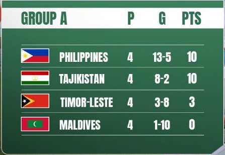 Дар бозии дигари гурӯҳи “А” тими Филиппин муқобили Тимори Шарқӣ бозӣ карда, бо ҳисоби 3:1 пирӯз шуд.