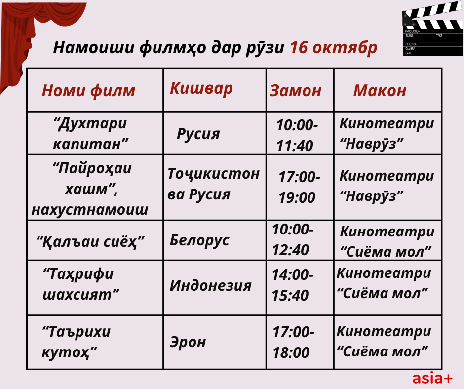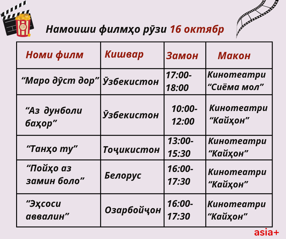 – Имрӯз дар толорҳои синамои пойтахт 10 филм аз кишварҳои гуногун ба намоиш гузошта мешавад. Вуруд озод аст. Дар баргаҳои мо бубинед, ки кадом филм кай ва дар кадом толор ба тамошо гузошта мешавад.