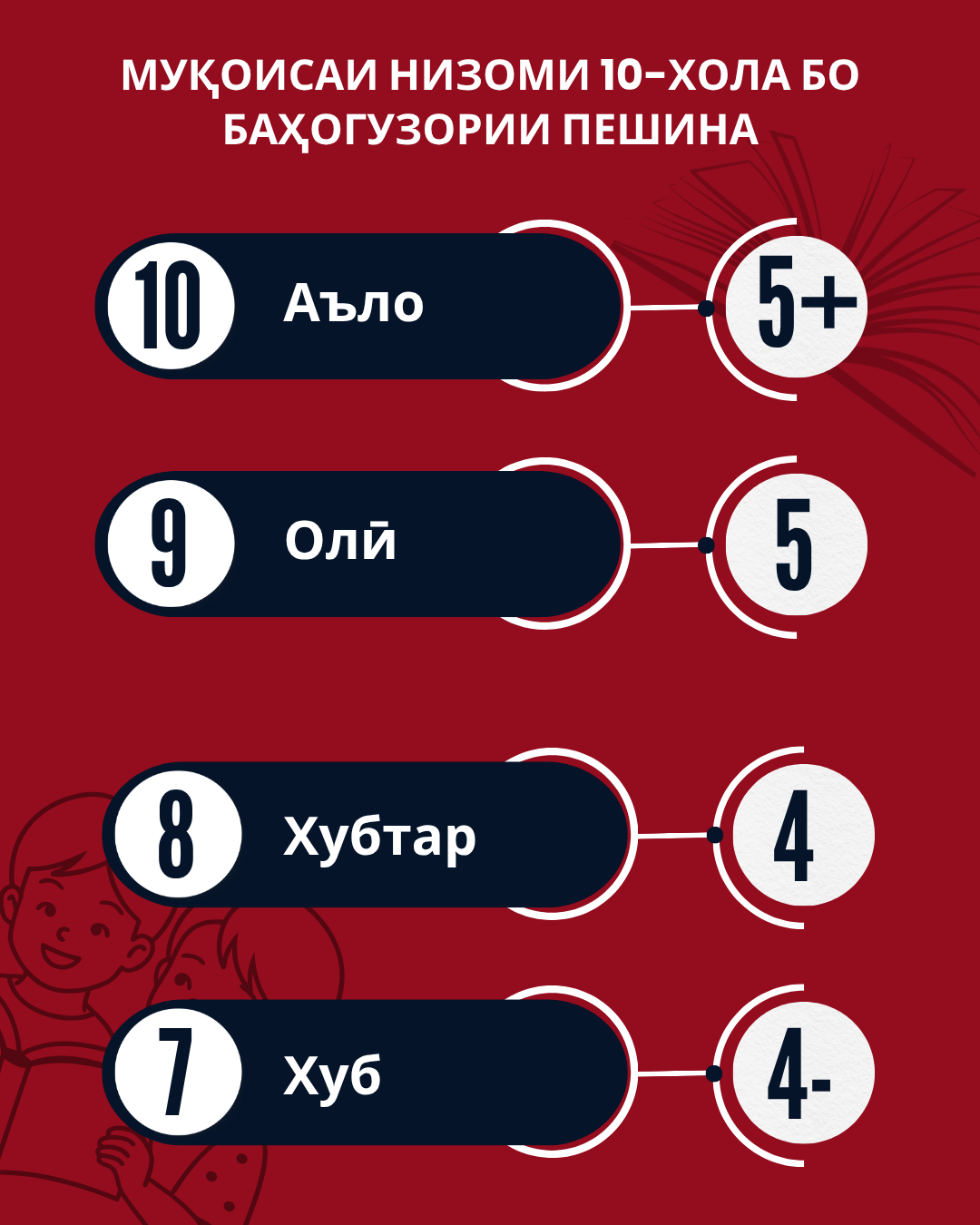 Аз Вазорати маориф ва илми кишвар гуфтанд, ки дар низоми баҳогузории 10-хола аломатҳои “-” ва “+” гузошта намешавад. Ин аломатҳо дар низоми пешина барои баҳогузории сатҳи омадагии хонанда истифода мешуданд.