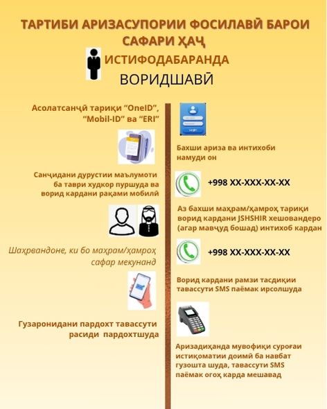 Кумитаи умури дини Ӯзбекистон хабар медиҳад, ки шаҳрвандон имкон доранд тавассути ду сомонаи давлатии www.my.gov.uz ва haj-www.umra.gov.uz сабти ном шаванд.