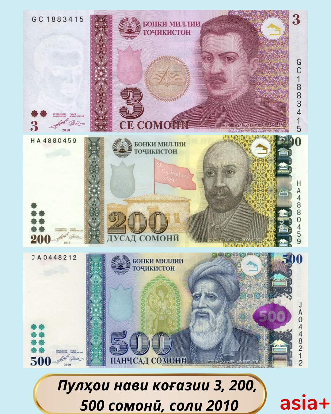 10-уми сентябри соли 2010 пулҳои нави коғазӣ бо арзиши 3, 200 ва 500 сомонӣ ба муомилот баромаданд.