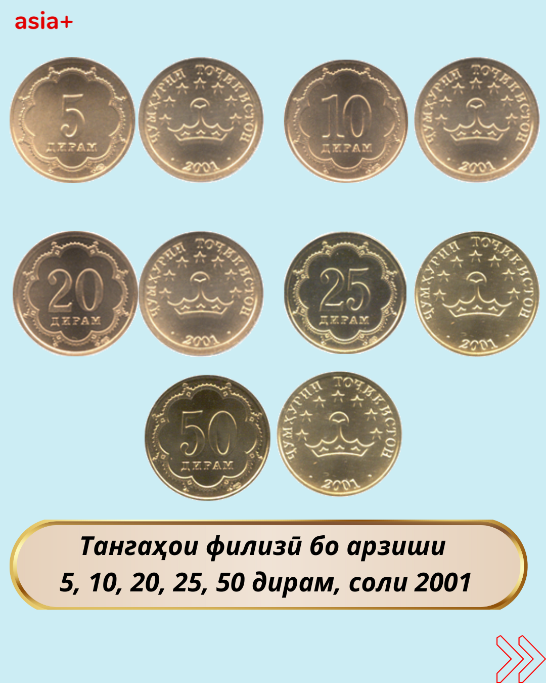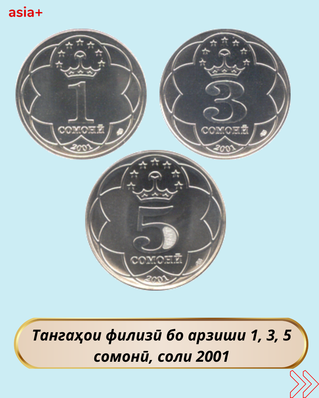 3-юми сентябри соли 2001 бошад Бонки миллии Тоҷикистон тангаҳои филизӣ бо арзиши 1, 3, 5 сомонӣ ва 5, 10, 20, 25, 50 дирам ба муомилот баровард.