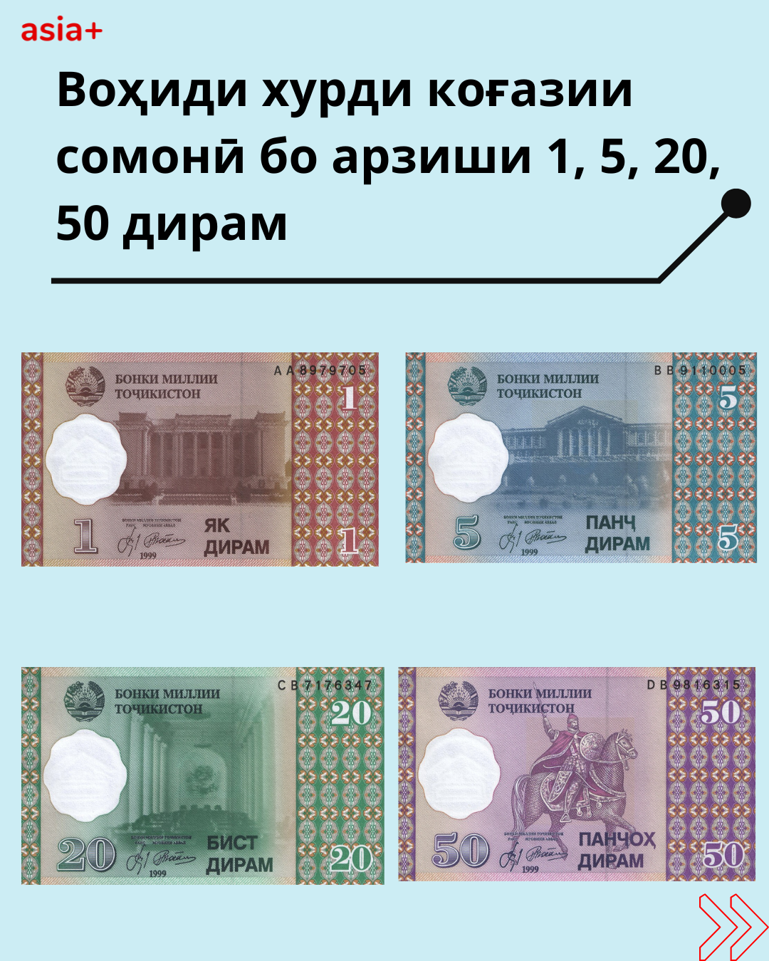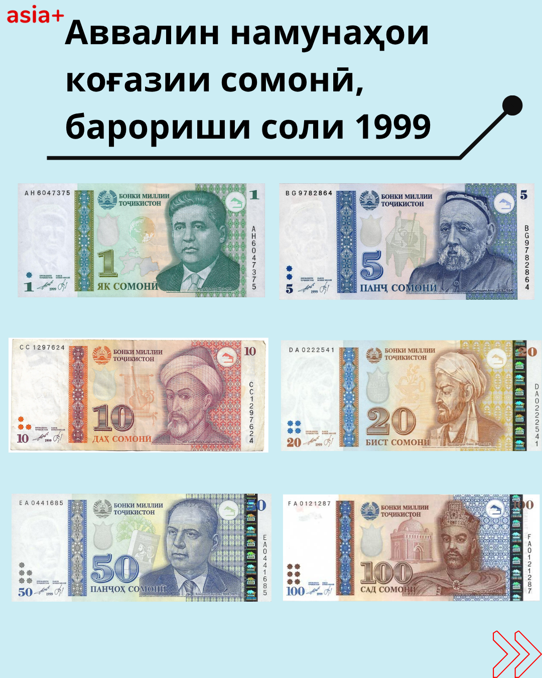 25 сол қабл, 30-юми октябри соли 2000, воҳиди нави пули миллии Тоҷикистон – “Сомонӣ” ба муомилот баромад. Он ба ифтихори Исмоили Сомонӣ, бунёдгузори нахустин давлати мутамаркази тоҷикон номгузорӣ шудааст. Аввалин маротиба пулҳои коғазӣ бо арзиши 1, 5, 10, 20, 50, 100 сомонӣ ва воҳиди хурди он бо арзиши 1, 5, 20, 50 дирам ба муомилот бароварда шуданд.