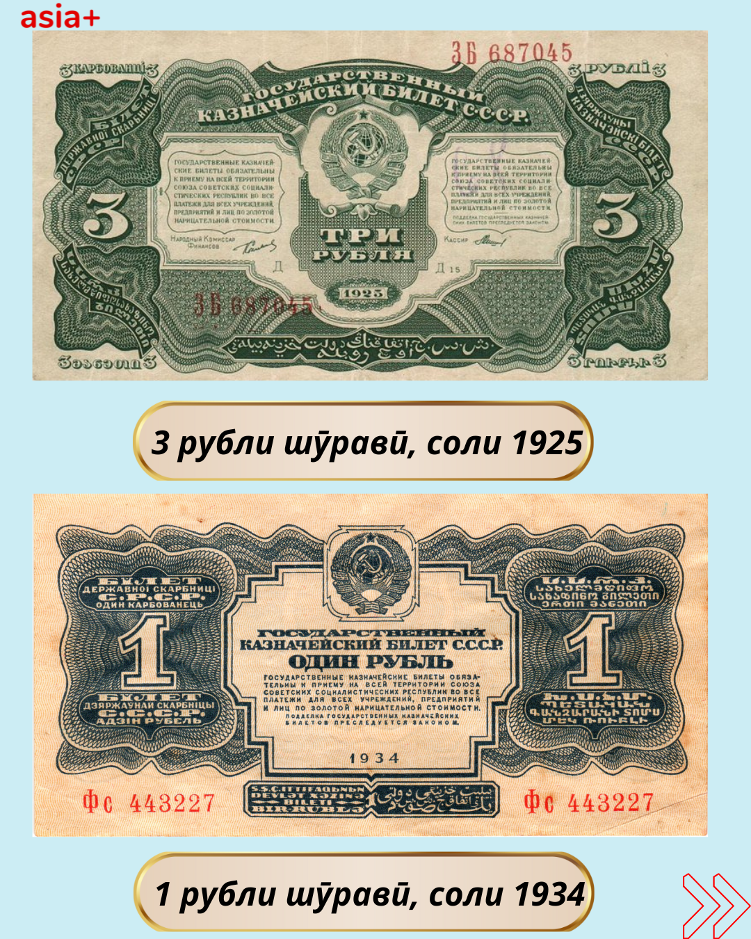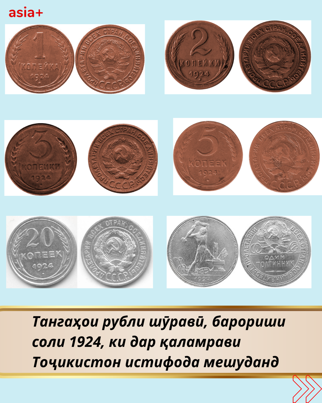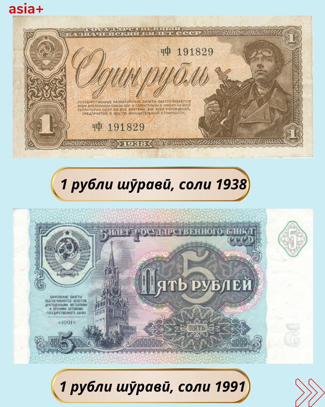 Дар баргаҳои мо бубинед, ки дар давраи Иттиҳоди шуравӣ кадом воҳидҳои пулии рубли шуравӣ бо барориши солҳои гуногун истифода мешуданд: