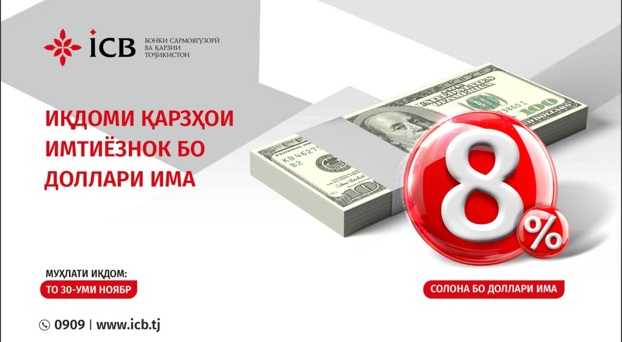Бо мақсади дастгирии рушди соҳаи соҳибкорӣ дар кишвар ва афзоиши дастрасии шаҳрвандон ба манбаъҳои молиявии имтиёзнок бо доллари ИМА, Бонки сармоягузорӣ ва қарзии Тоҷикистон (ICB) иқдоми махсуси қарзиро роҳандозӣ намуд. Дар доираи иқдом қарзҳо бо доллари ИМА аз 8 фоиз солона, ба маблағи то 300 000 доллари ИМА ва ба муҳлати то 48 моҳ пешниҳод карда мешавад.