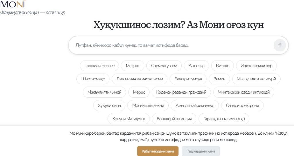 Ҳуши маснӯӣ (AI)-и ёвари ҳуқуқии "Moni" ин захираи иттилоотиест, ки барои фаҳмиши қонунҳо ва заминаи меъёриву ҳуқуқӣ бунёд шудааст. Замима дар бораи мавзуъҳои гуногун – аз масоили андоз то ҳуқуқ ба қитъаи замин ба корбарон ройгон маълумот пешнҳиод мекунад.