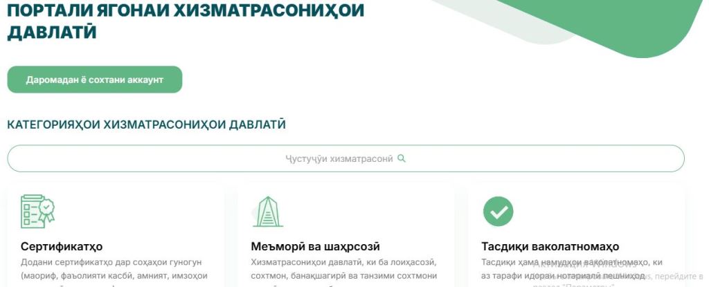 Портали ягонаи хидматрасониҳои давлатӣ ҷиҳати анҷоми расмиёти қисмате аз муроҷиатҳо ба сохтори давлатӣ дар шакли электронӣ бидуни шахсан рафтан ба ин корхонаву ташкилот ё муассиса имкон медиҳад. Система бо механизми содда ва фаҳмо сохта шудааст.