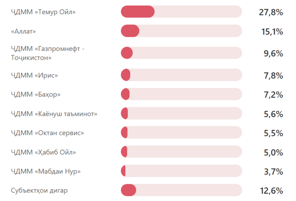 Ба воридоти гази моеъ дар ин давра 15 ширкат машғул шудаанд, ки ҳиссаи нисбатан бештараш ба ин ширкатҳо рост меояд: