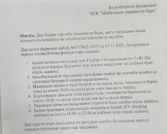 Дар нусхаи як мактуб, ки бо имзои Салвӣ Маноҷ, директори ҶСК “Шабакаҳои тақсимоти барқ” аз 27-уми ноябри соли 2025 ба мақомоти зертобеи ин ниҳод ирсол шуда, дар шабакаҳои иҷтимоӣ нашр шудааст, талаб мешавад, ки “тартиби таъминоти барқ, қатъ гардидани баъзе истеъмолкунандагон”-ро фавран иҷро кунанд.