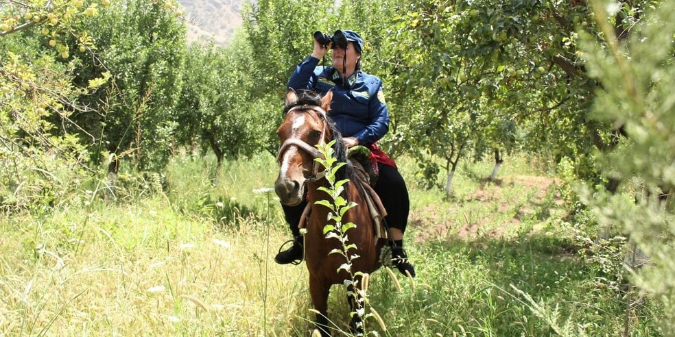 Сафарбӣ ҳамарӯза бо либоси низомӣ, аспу дурбин ва дастгоҳ барои тамос барои адои вазифаи худ ба ҷангал меравад.
