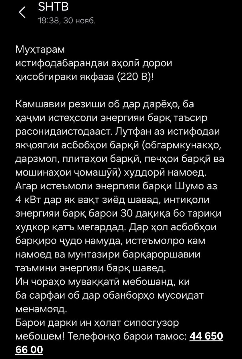 Дар пайи шадид шудани маҳдудияти барқ дар Тоҷикистон, "Шабакаи тақсимоти барқ", ки масъули тақими барқ дар кишвар аст, бо ирсоли як паёмаки телефонӣ ба аҳолӣ ҳушдор додааст, ки "дар сурати истифодаи зиёда аз 4 киловат (кВт) барқ дар хона интиқоли барқ ҳудуди 30 дақиқа ба таври худкор (автоматӣ) қатъ мешавад".