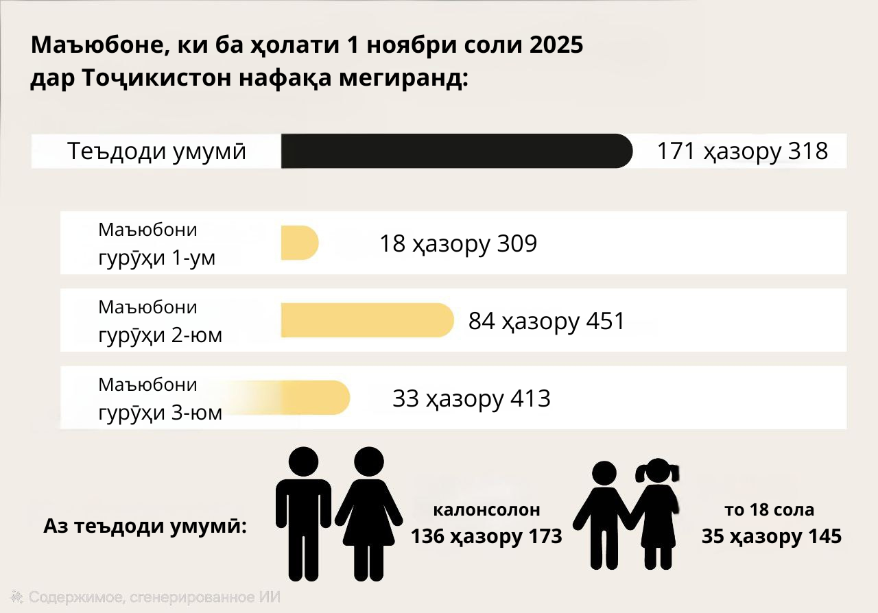 Саъдулло Қудратуллозода, сардори раёсати таъину пардохти нафақа ва андӯхтҳои нафақавии Агентии суғуртаи иҷтимоӣ ва нафақа ба “Азия Плюс” гуфт, ки ба ҳолати 1-уми ноябри соли равон дар кишвар 171 ҳазору 318 шахсонин дорои маъюбият сабт шудаанд ва нафақа мегиранд.