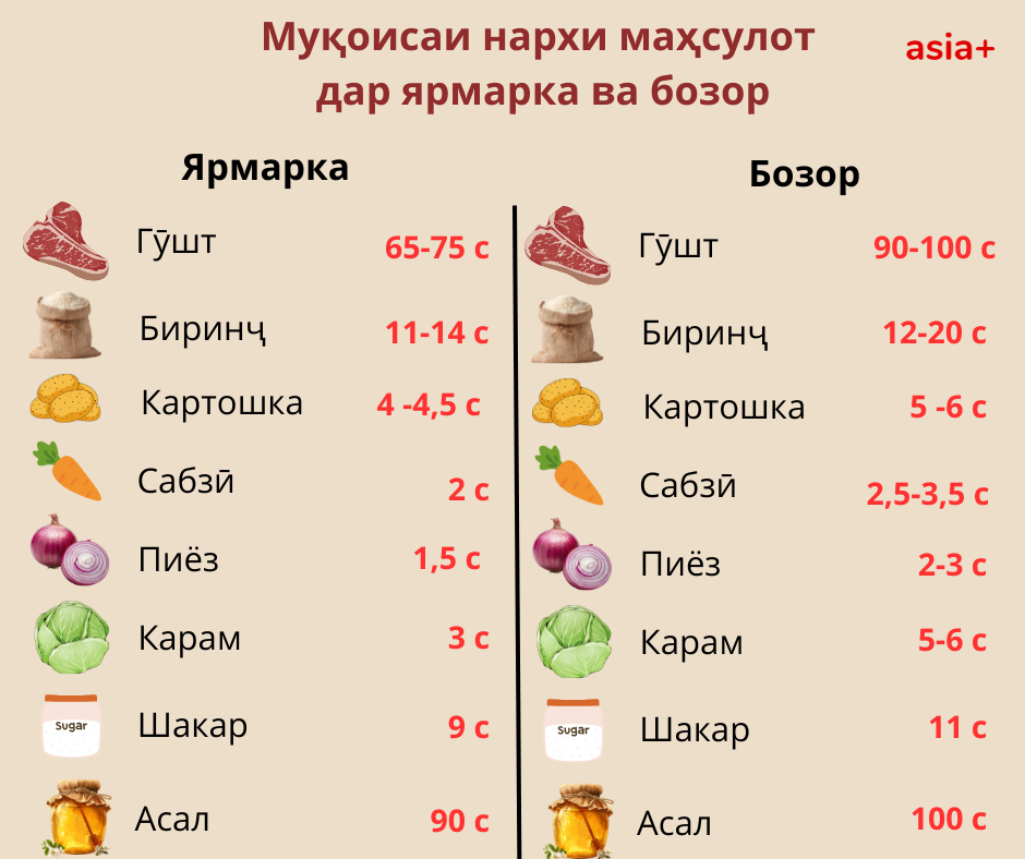 Тавре маълум шуд, нархи маҳсулот нисбат ба нархи бозор он қадар фарқияти зиёде надоранд, аммо нархи гӯшт, ки вақтҳои охир сокинони кишварро нигарон кардааст, дар ярмарка ба таври назаррас поён аст. Нархи як килограмм гӯшти гов 65 сомонӣ ва гӯшти гусфанд 75 сомонӣ аст, дар ҳоле, ки дар бозор нархи он аз 100 сомонӣ оғоз меёбад.