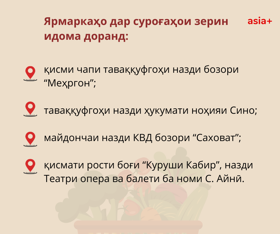 Ярмаркаҳо дар суроғаҳои зерин идома доранд: