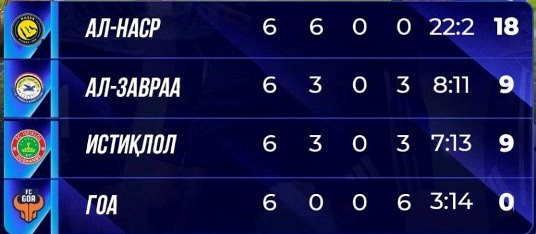 Дар бозии дигари гурӯҳи “D”, ки “Истиқлол” ҳам шомили он аст, тими “Ан-Наср”-и Арабистони Саудӣ дар баробари “Аз-Завра”-и Ироқ бо ҳисоби калони 5:1 ғалаба кард.