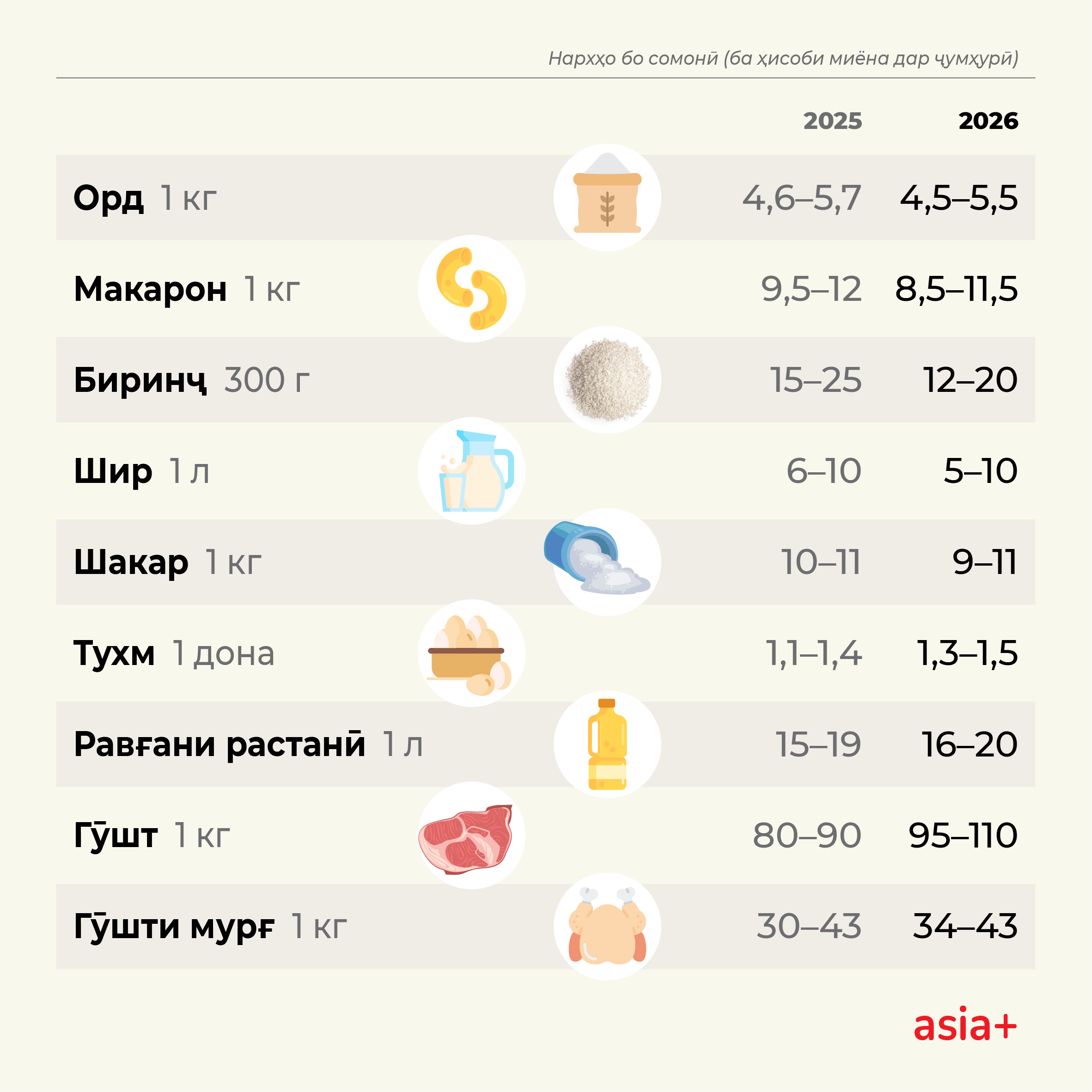 Соли гузашта бештар гӯшт гарон шуд. Нархи 1 кг гӯшти гов то 95-110 сомонӣ ва гӯшти мурғ – то 34-43 сомонӣ боло рафт. Дар маҷмӯъ, соли 2026 болоравии нарх бештар ба гӯшт ва маҳсулоти ҷудогонаи воридотӣ дахл карда, ҳамзамон дар маҳсулоти мавриди ниёзи аввал тағйироти ҷиддӣ ба мушоҳида нарасид.