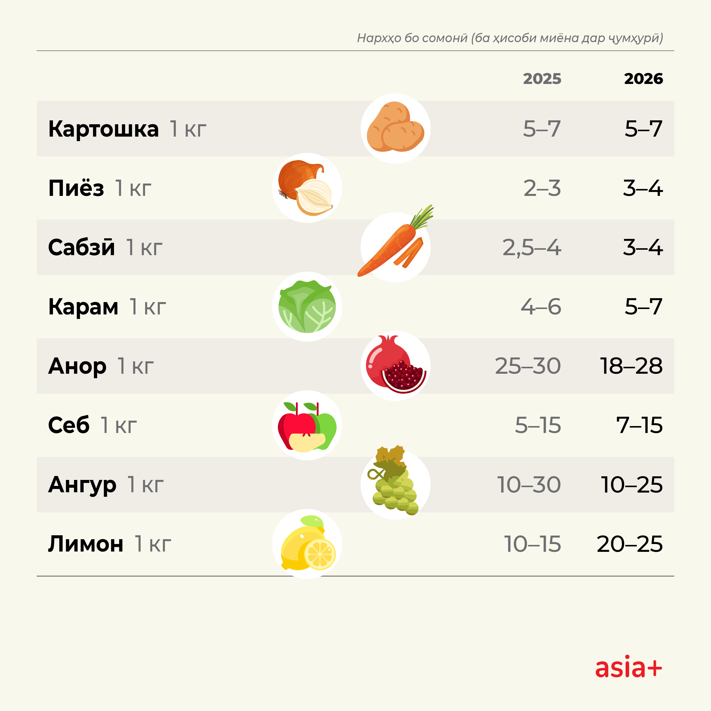 Аз ҷумла, нархи картошка дар сатҳи пешин – 5-7 сомонӣ барои 1 кг боқӣ монд. Дар ҳамин ҳол, пиёз ва сабзӣ тақрибан 1 сомонӣ гарон шуда, 1 кг карам акнун 5-7 сомонӣ фурӯхта мешавад.