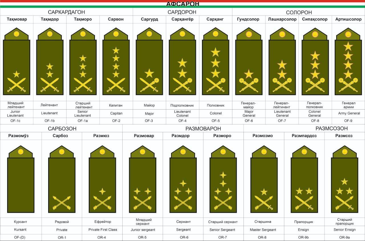 Дар Тоҷикистон масъалаи тоҷикӣ кардани дараҷаҳои низомӣ солҳо боз мавриди баҳс қарор дорад. Соли 2018 Умед Ҷайҳонӣ, донишманд ва пажӯҳишгари тоҷик, тарҳеро бар асоси истилоҳоти “Шоҳнома” ва сипоҳи давлатҳои тоҷикии Ашкониён, Сосониён ва Сомониён пешниҳод кард.