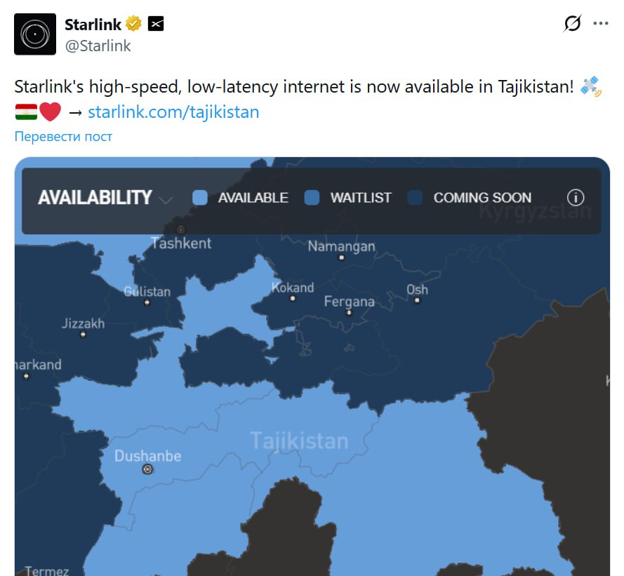 “Интернети баландсуръати Starlink акнун дар Тоҷикистон дастрас аст”, – навиштааст ин ширкат дар Х.