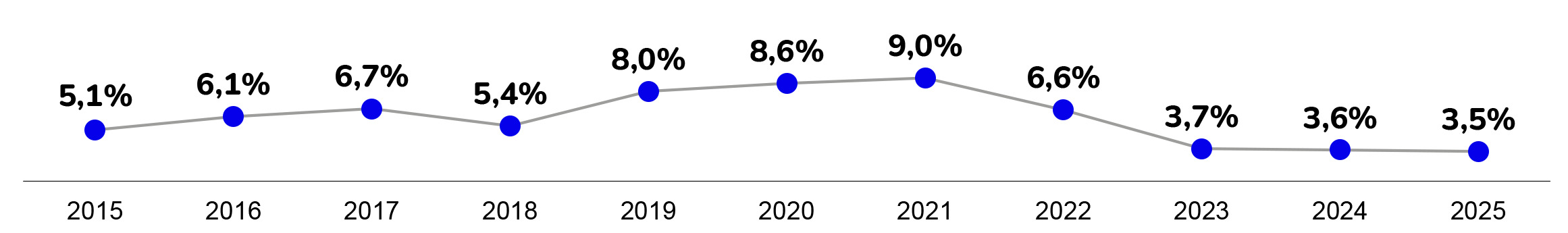 Тайи даҳ соли ахир Тоҷикистон бо сатҳҳои гуногуни таваррумро аз сар гузаронид – аз 3,5% то 9% . Бино ба маълумоти расмӣ, давоми солҳои 2015-2025 сатҳи болоравии нархҳои истеъмолӣ тариқи зайл буд: