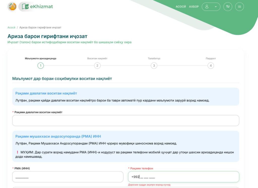Нусхаи аризаи дар равзана пайдошударо пур кунед. Пас аз ворид кардани маълумот дар бораи автомобил, низом ба таври худкор арзиши гирифтани иҷозатномаро ҳисоб ва натиҷаашро пешниҳод мекунад. Маблағи онро метавонед дар худи пойгоҳ онлайн пардохт кунед.