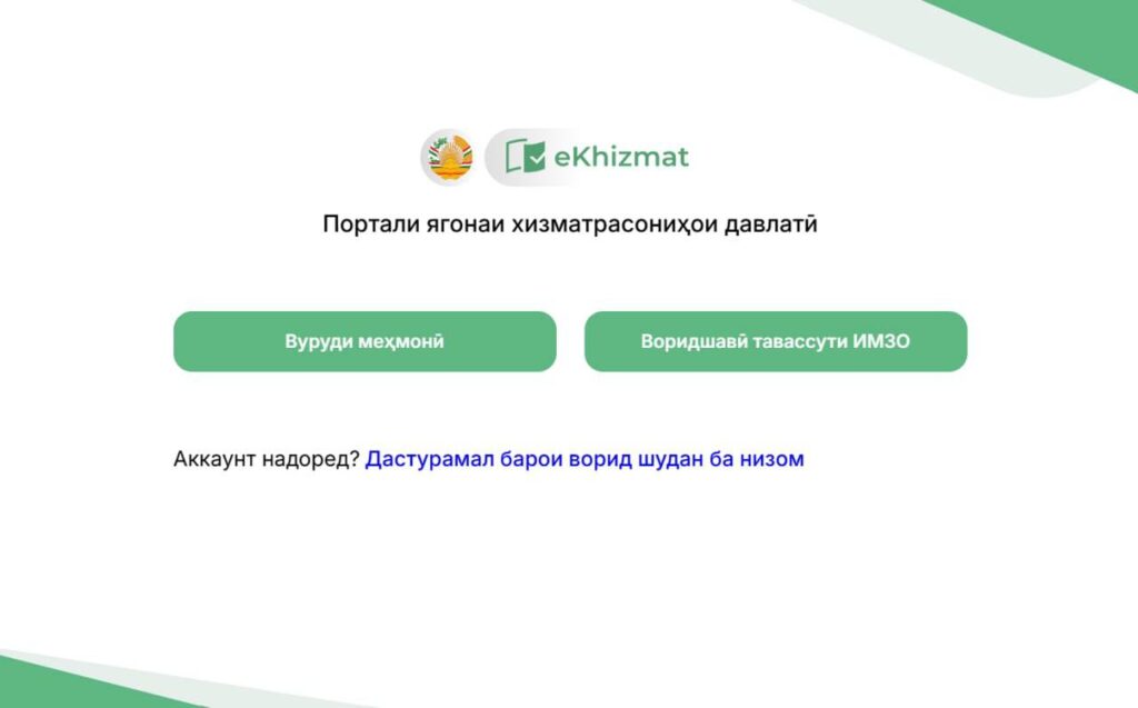 Пас аз ин, ба Пойгоҳ (khizmat.ehukumat.tj) ворид шуда, тугмаи “воридшавӣ тариқи IMZO” -ро пахш ва рақами телефон ва рамзи яккаратаи тариқи паёмак омадаро ишора кунед.