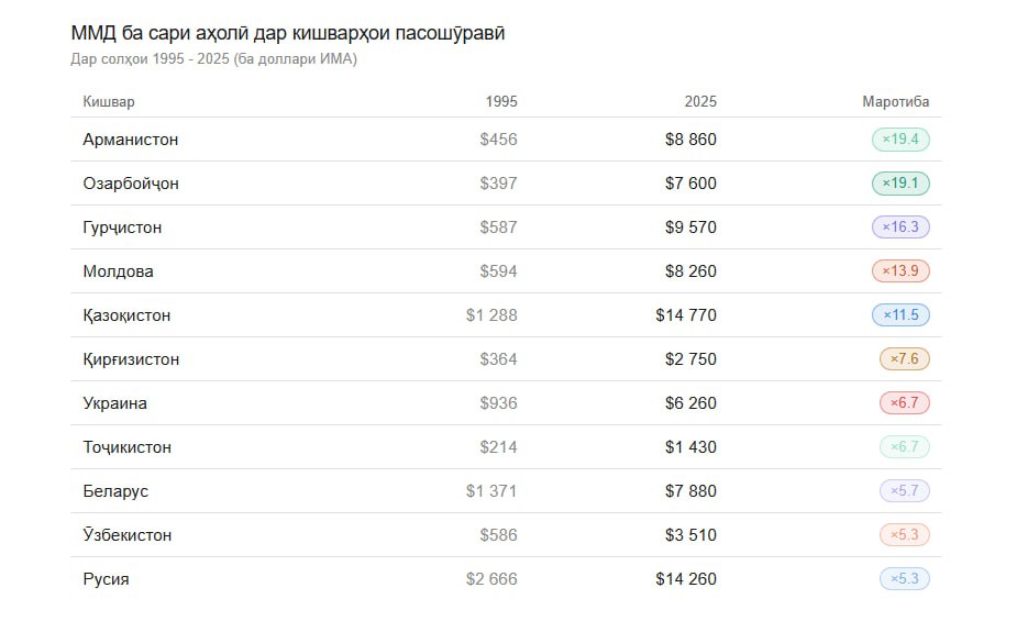 Шабакаи Telegram-ил “Геостатистика” хабар медиҳад, ки тайи 30 соли ахир ММД-и номиналӣ ба ҳар сари аҳолӣ дар Тоҷикистон 6,7 баробар афзуд. Соли 1995 нишондиҳандаи мазкур ҳамагӣ ба 214 доллар баробар буд.
