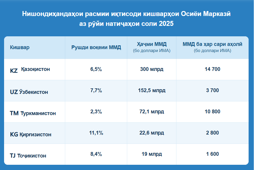 Дар соли 2025 рушди бештар дар иқтисоди Қирғизистон (11,1%) ва пасттарин, дар Туркманистон (2,3%) ба қайд гирифта шуд. Дар идома Тоҷикистон (8,4%), Ӯзбекистон (7,7%) ва Қазоқистон (6,5%) қарор гирифтаанд. Аз лиҳози ҳаҷми ММД ба ҳар сари аҳолӣ дар минтақа Тоҷикистон дар мақоми охир ҷойгир шудааст.