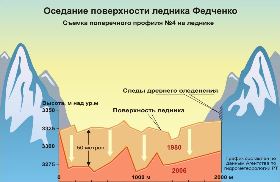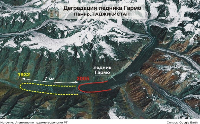По данным Агентства по гидрометеорологии Таджикистана, среднегодовая температура в республике, как в долинах на высоте 1000 метров от уровня моря, так и в горах на высоте от 2500 метров, за последние 70-80 лет повысилась и это приводит к отступлению основной части ледников.