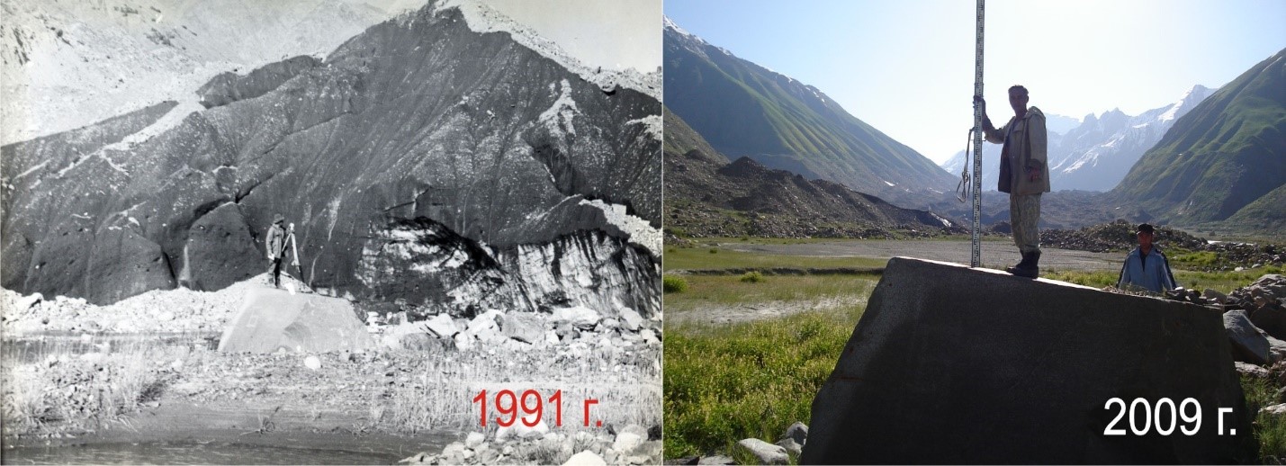 При посещении ледника Зерафшанский в 1979 году граница его языка находилась в 200-250 м от ориентира. Ледник продолжает отступать и уменьшается по площади и по объему. Фото: Центр гляциологии Агентства по гидрометеорологии Таджикистана.