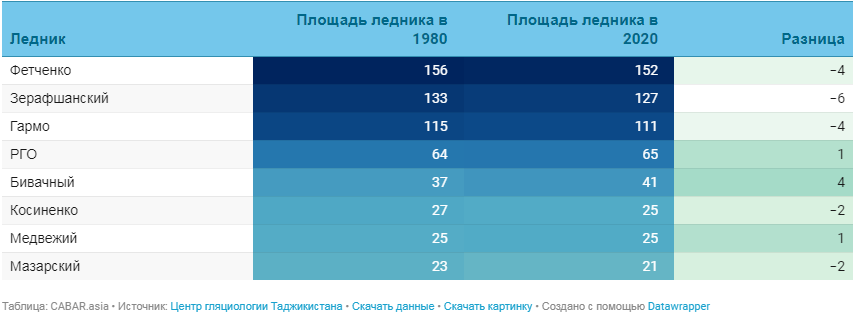 Площадь крупных ледников Таджикистана и их уменьшение в период с 1980 по 2020 годы в кв. км